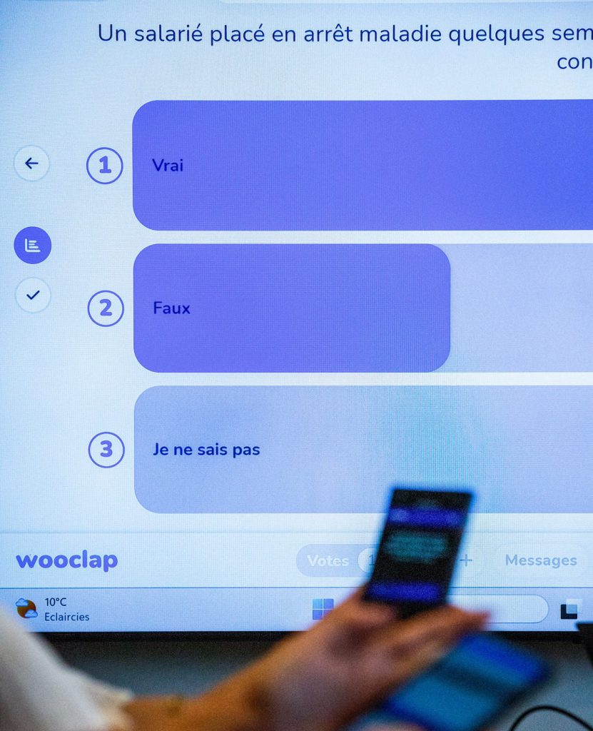 Grâce à un outil informatique, les stagiaires répondent en direct à un QCM technique en lien avec la formation suivie en début et fin de journée.